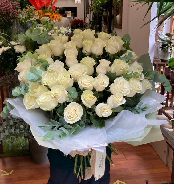 El soprendente Ramo de 50 rosas, sin verdes ni rellenos, unicamente la belleza de las rosas.